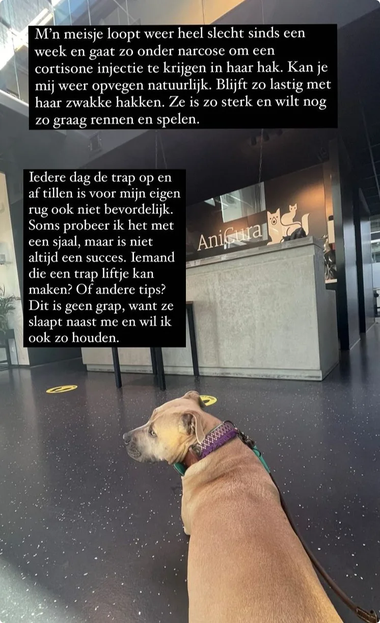 Zo schrijft Monique emotioneel in haar Instagram Stories dat Gioia weer heel slecht loopt. "Iedere dag de trap op en af tillen is voor mijn rug ook niet bevorderlijk (...) Iemand die een trapliftje kan maken of andere tips? Dit is geen grap, want ze slaapt naast me en wil ik ook zo houden."