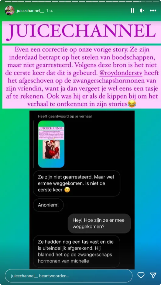 Later kwam Juichechannel met de nieuwe update dat Roy en Michelle wel zouden zijn betrapt op het stelen van boodschappen, maar dat ze niet waren gearresteerd: