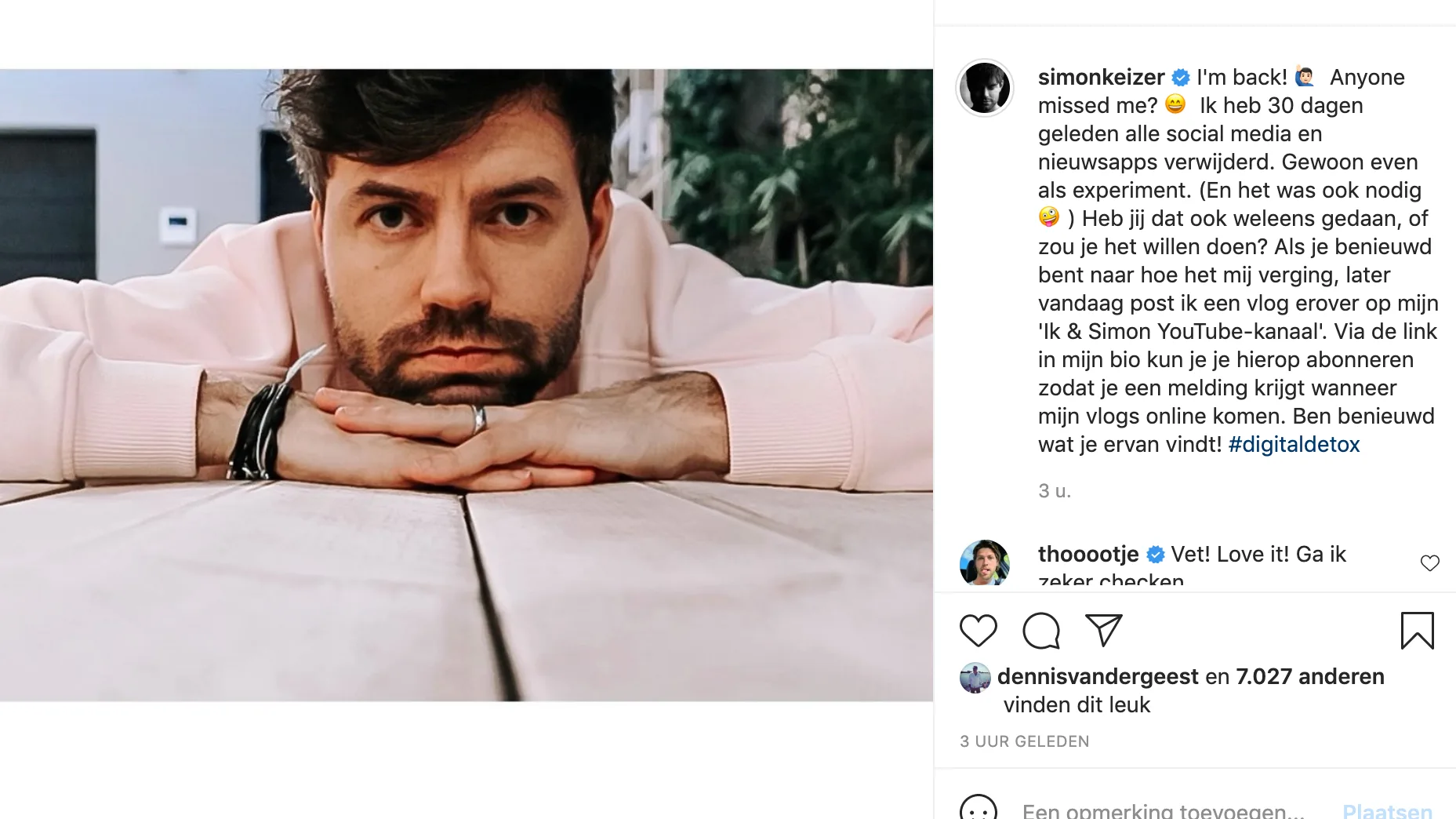 Op Instagram schrijft hij: "I'm back! Anyone missed me? Ik heb 30 dagen geleden alle social media en nieuwsapps verwijderd. Gewoon even als experiment. (En het was ook nodig ) Heb jij dat ook weleens gedaan, of zou je het willen doen?(...)#digitaldetox."