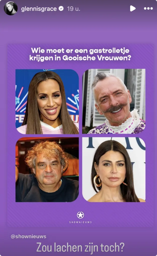 Shownieuws heeft aan de Gooische Vrouwen-fans gevraagd wie ze nog in de serie willen zien. Als opties staan er Glennis Grace, Martien Meiland, Frank Lammers of Olcay Gulsen. En Glennis ziet dat gastrolletje wel zitten. Ze plaatst de foto namelijk op haar Stories en schrijft erbij: "Zou lachen zijn toch?"