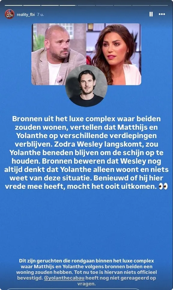 Volgens het juicekanaal zou Matthijs ook in hetzelfde complex in Los Angeles wonen als waar Yolanthe woont, maar op verschillende verdiepingen. Wesley zou hiervan niet op de hoogte zijn. "Zodra Wesley langskomt, zou Yolanthe beneden blijven om de schijn op te houden. Bronnen beweren dat Wesley nog altijd denkt dat Yolanthe alleen woont", aldus RealityFBI.