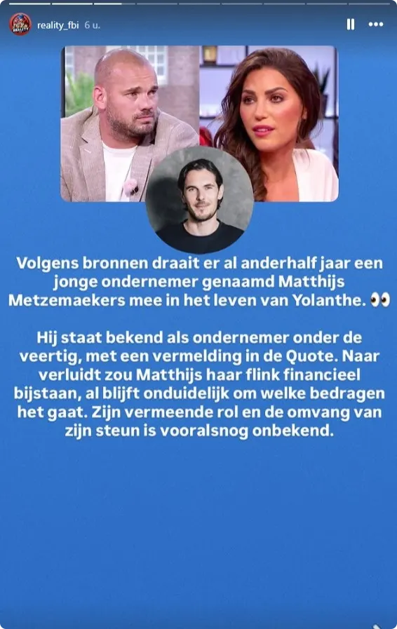 "Volgens bronnen draait er al anderhalf jaar een jonge ondernemer, genaamd Matthijs Metzemaekers, mee in het leven van Yolanthe”, aldus RealityFBI. "Hij staat bekend als ondernemer onder de veertig, met een vermelding in de Quote. Naar verluidt zou Matthijs haar flink financieel bijstaan.”