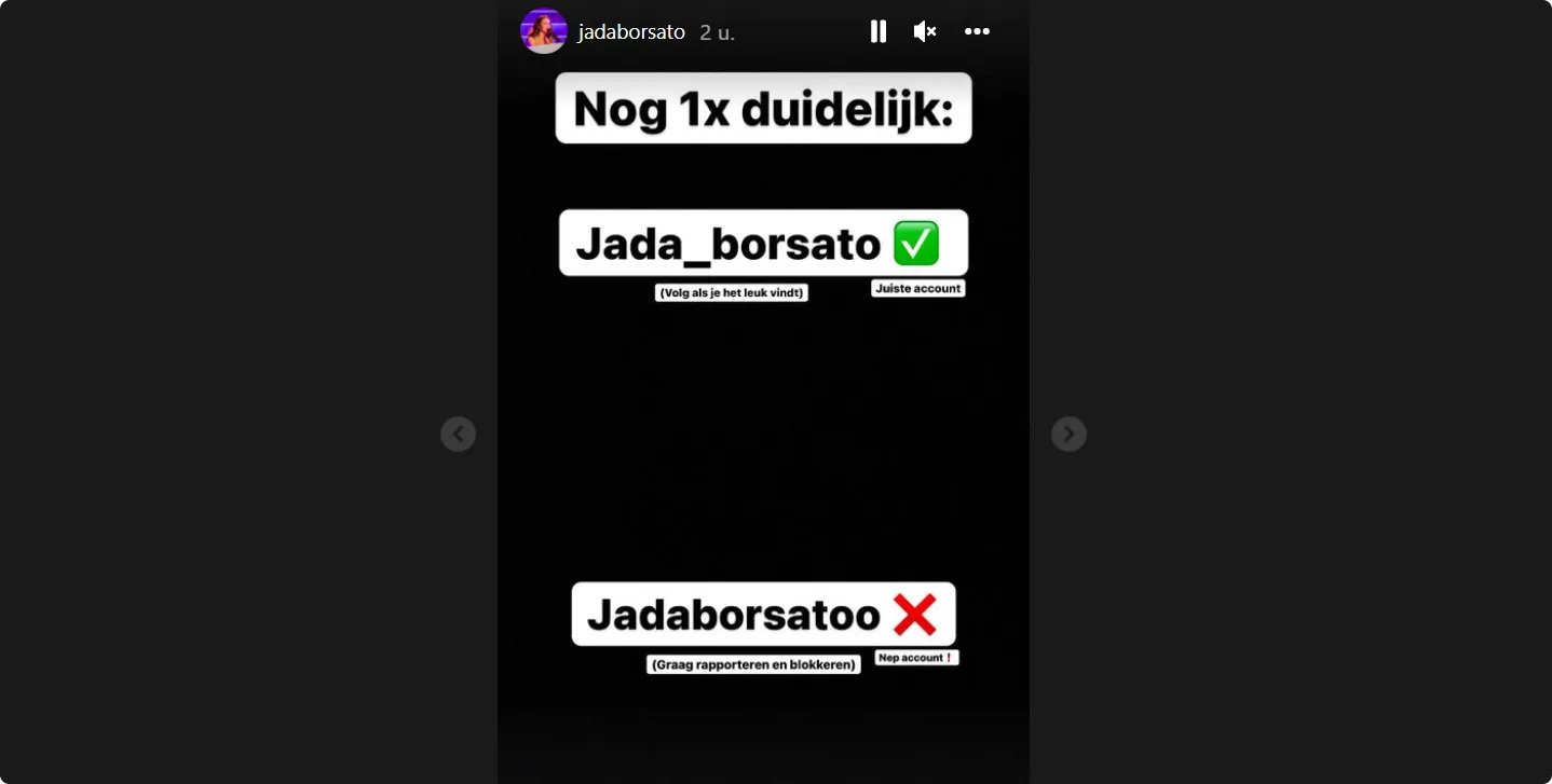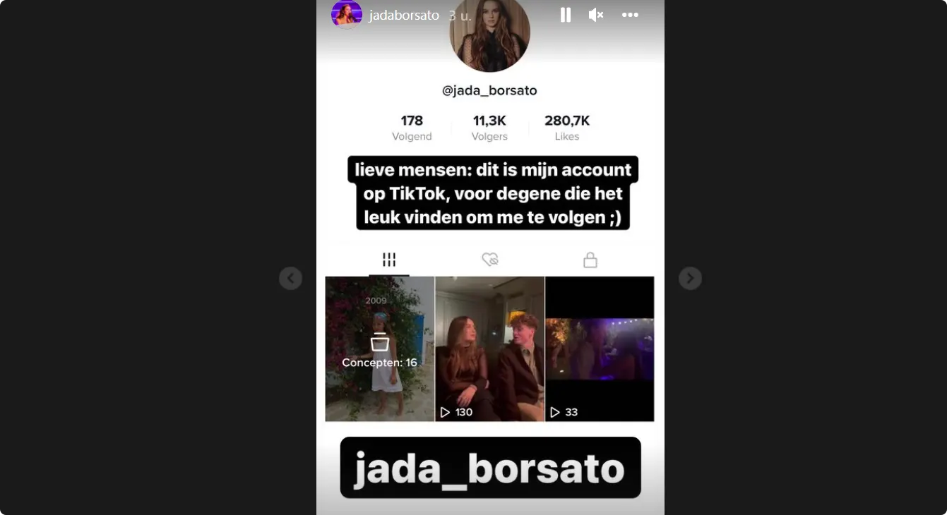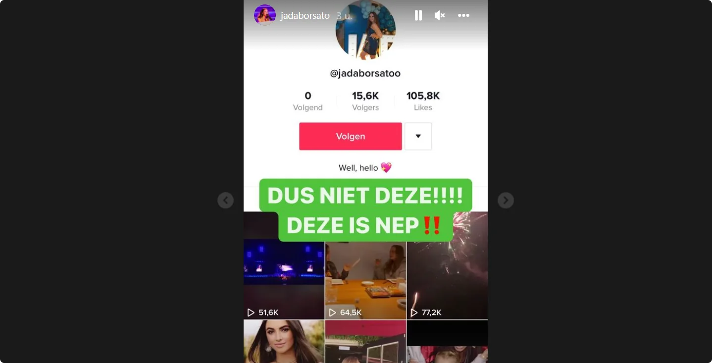 Even later blijkt waarom. Bij een screenshot van een ánder Jada Borsato TikTok-account schrijft ze namelijk: "DUS NIET DEZE!!!! DEZE IS NEP!!"