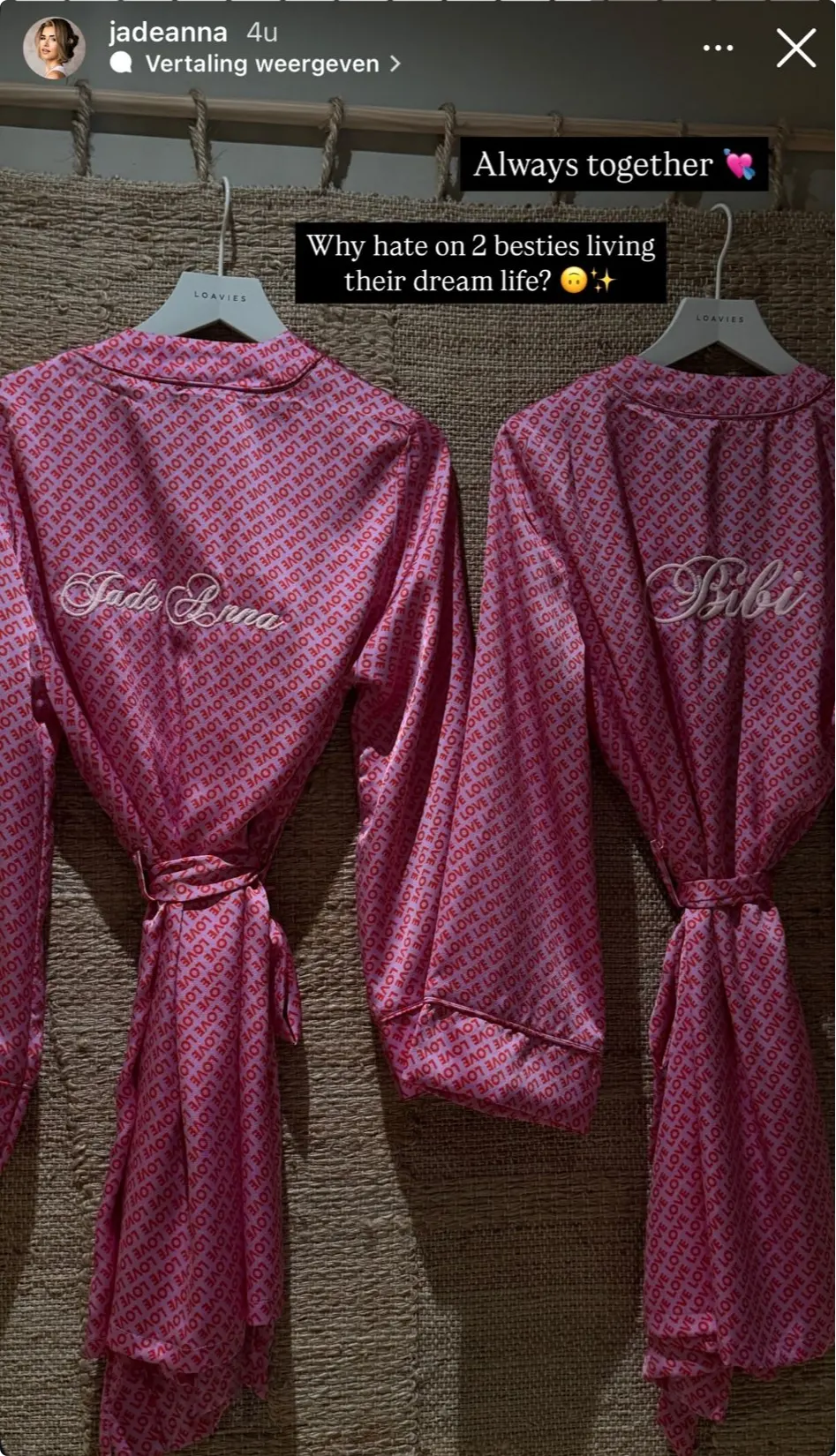 Jade reageert op de kritiek in haar Instagram-Story en geeft een fel tegenantwoord. Bij een foto van de badjassen van haarzelf en Bibi schrijft ze: "Altijd samen. Waarom haten op twee beste vriendinnen die hun droomleven leven?"