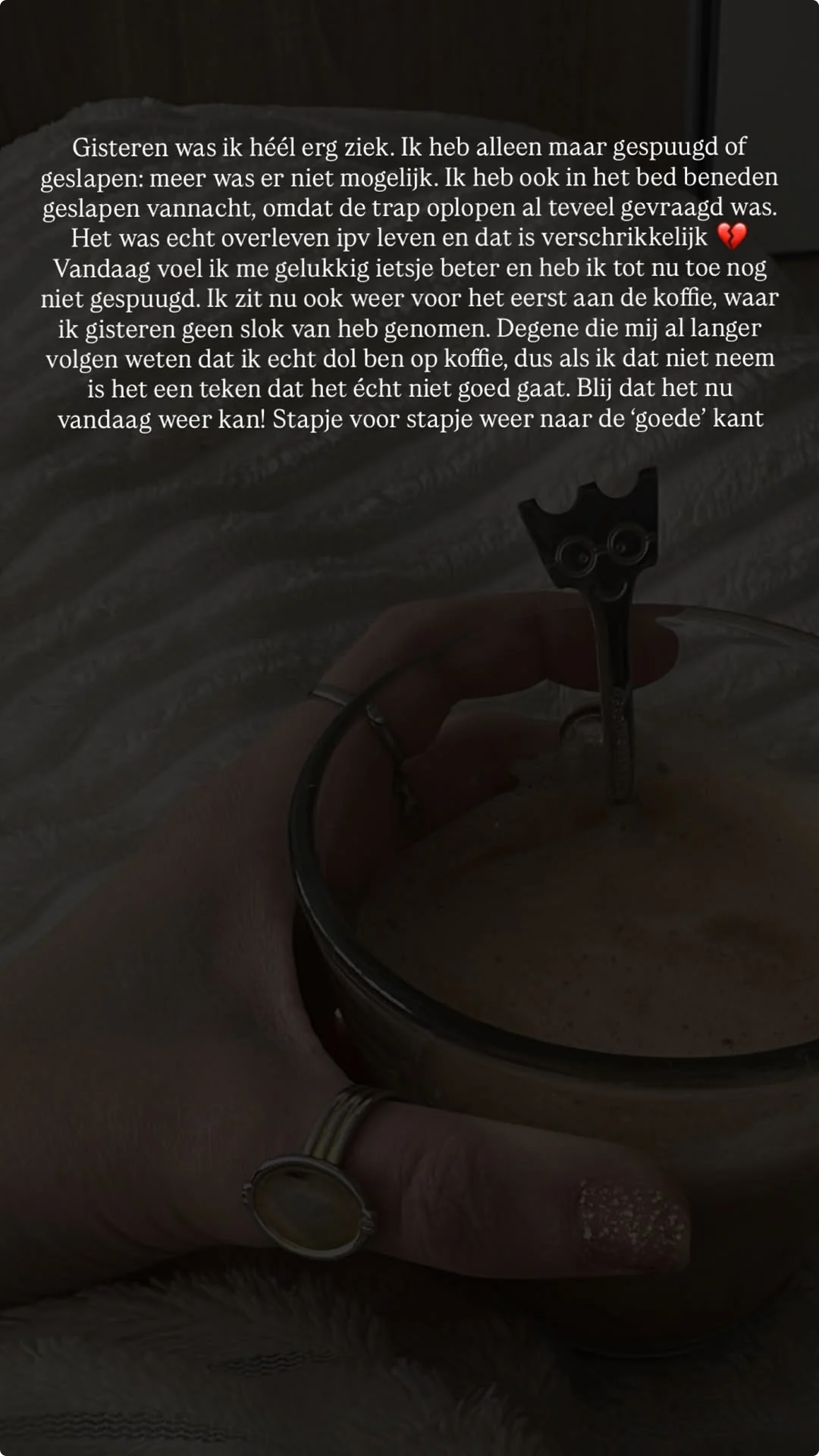 De situatie was zo zwaar dat Jade in het bed moest slapen die zich in de woonkamer bevindt. "Ik heb in het bed beneden geslapen vannacht, omdat de trap oplopen al te veel gevraagd was.” Vandaag voelt ze zich gelukkig iets beter. "Ik heb tot nu toe nog niet gespuugd. Ik zit nu ook weer voor het eerst aan de koffie, waar ik gisteren geen slok van heb genomen." Voor Jade, die bekendstaat als enorme koffieliefhebber, zegt dat genoeg: "Als ik dat niet neem, is het écht niet goed."