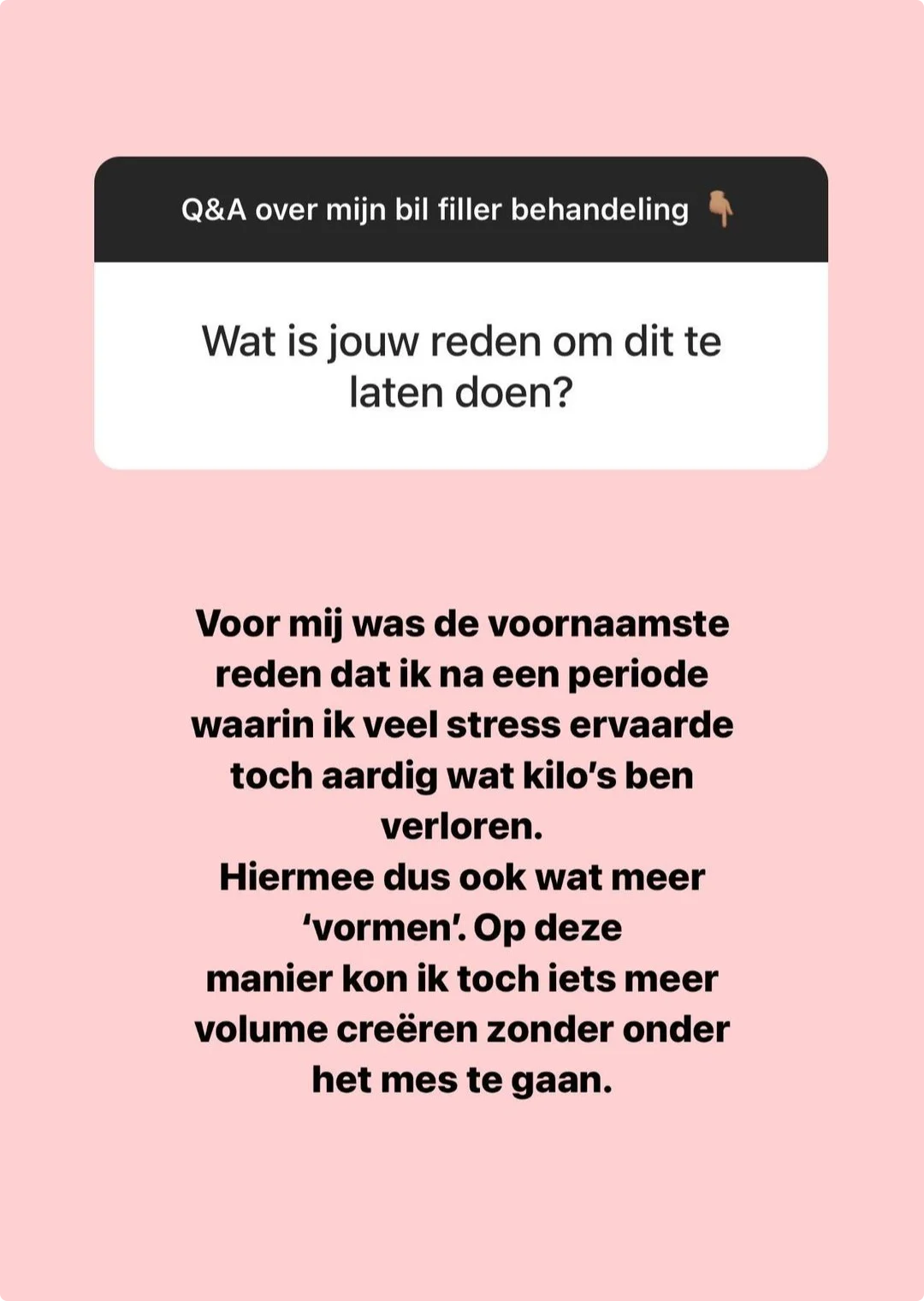 Jaimie vertelde onlangs nog waarom ze ervoor koos om moeder natuur een handje te helpen. "Voor mij was de voornaamste reden dat ik na een periode waarin ik veel stress ervaarde toch aardig wat kilo’s ben verloren. Hiermee dus ook wat meer ‘vormen", zegt de ex van Lil Kleine in een Q&A. Ze koost bewust voor fillers: "Op deze manier kon ik toch iets meer volume creëren zonder onder het mes te gaan."