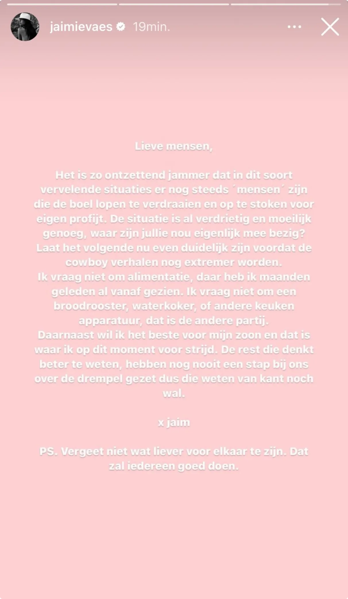 Zo schrijft Jaimie: "Het is ontzettend jammer dan in dit soort vervelende situaties er nog steeds 'mensen' zijn die de boel lopen te verdraaien en op te stoken voor eigen profijt..... Ik vraag niet om alimentatie, daar heb ik maanden geleden vanaf gezien. Ik vraag niet om een broodrooster, waterkoker, andere keukenapparatuur, dat is de andere partij", schrijft Vaes.
