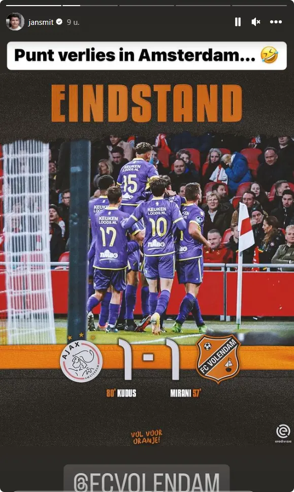 De voorzitter van de Volendamse voetbalclub laat op Instagram van zich horen na de 1-1. Volendam stond een tijdje 0-1 voor, maar uiteindelijk maakte Ajax in de 80e minuut nog de gelijkmaker.