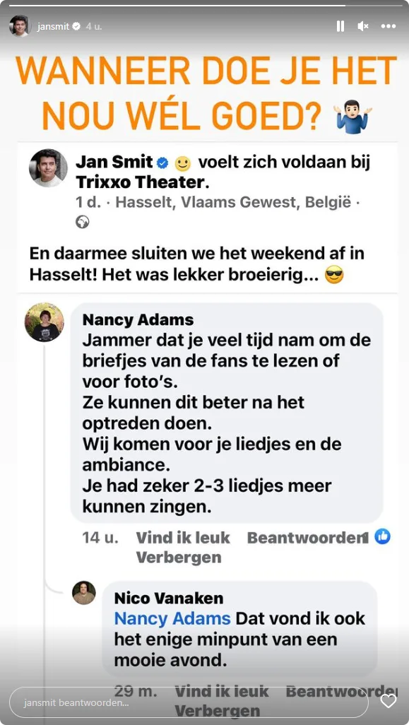 Iemand anders die bij het optreden aanwezig was, is het daarmee eens. "Dat vond ik ook het enige minpunt van de avond", reageert hij. Jan snapt het commentaar niet en haalt naar de bezoekers uit. "Wanneer doe je het nou wél goed?", aldus Jan in zijn Instagram Stories.