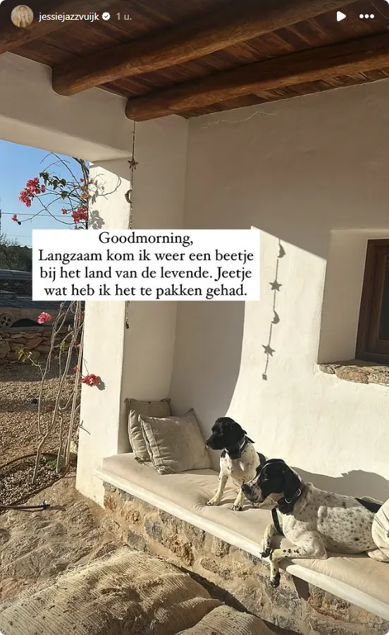 "Goedemorgen, langzaam kom ik weer een beetje bij het land van de levende. Jeetje, wat heb ik het te pakken gehad", zo schrijft Jessie Jazz in haar Instagram Stories bij ene foto van hun huis op het Spaanse eiland Ibiza.