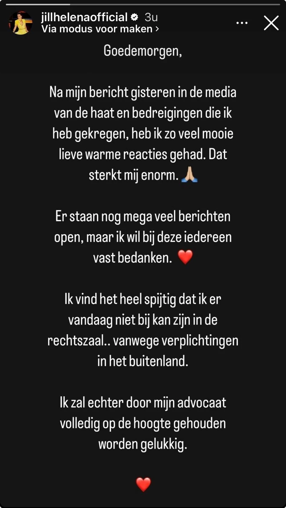 Jill Helena, een van de vermeende slachtoffers van Ali B (zie video), heeft bedankt voor de berichten die ze heeft ontvangen. De ex-kandidaat van The Voice of Holland vertelde eerder deze week dat ze ook veel bedreigingen had gehad en kreeg daarna veel "mooie lieve warme" reacties, schrijft ze in haar Instagram Stories.