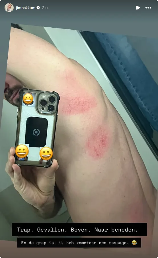 Zanger Jim Bakkum is van een trap gevallen. Hij deelt op Instagram een foto van zijn rug met flinke schaafwonden. "Trap. Gevallen. Boven. Naar beneden", schrijft de 37-jarige zanger bij de afbeelding. Naast de schaafwonden gaat alles goed met hem, laat Jim aan het ANP weten.