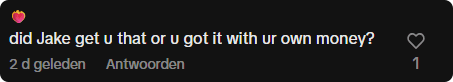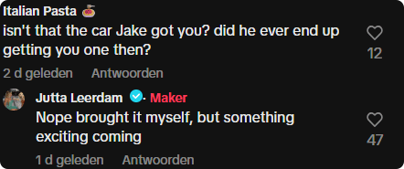 "Is dat niet de auto die Jake voor je heeft gekocht?", schrijft iemand. Jutta is gelijk duidelijk: "Nee, deze heb ik zelf gekocht, maar er komt iets leuks aan." Andere volgers zijn vooral trots op Jutta.
