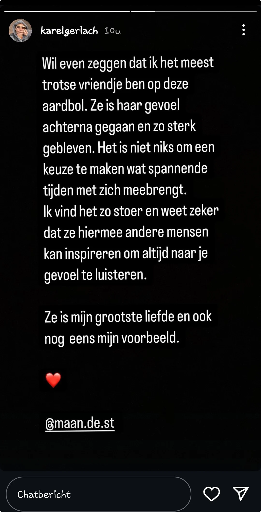 Vrijdag, gelijktijdig met het uitkomen van Maans nieuwe album Eclipse, verschijnt een lieve Instagram Story op het account van Karel, waarin hij verklaart: "Wil even zeggen dat ik het meest trotse vriendje ben op deze aardbol. Ze is haar gevoel achterna gegaan en zo sterk gebleven."