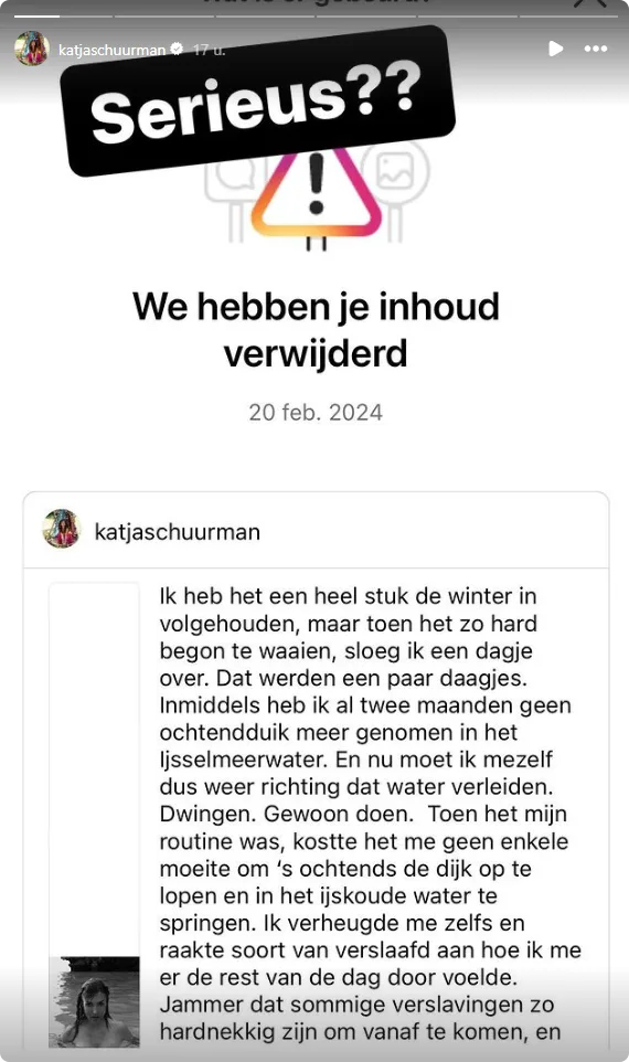 Katja Schuurman deelt op haar Instagram-pagina pikante foto's van haarzelf, maar deze zijn verwijderd door het platform en hier is ze nogal verbaasd over. Ze kwam al eerder onder vuur door een Instagram-post (zie video)...
