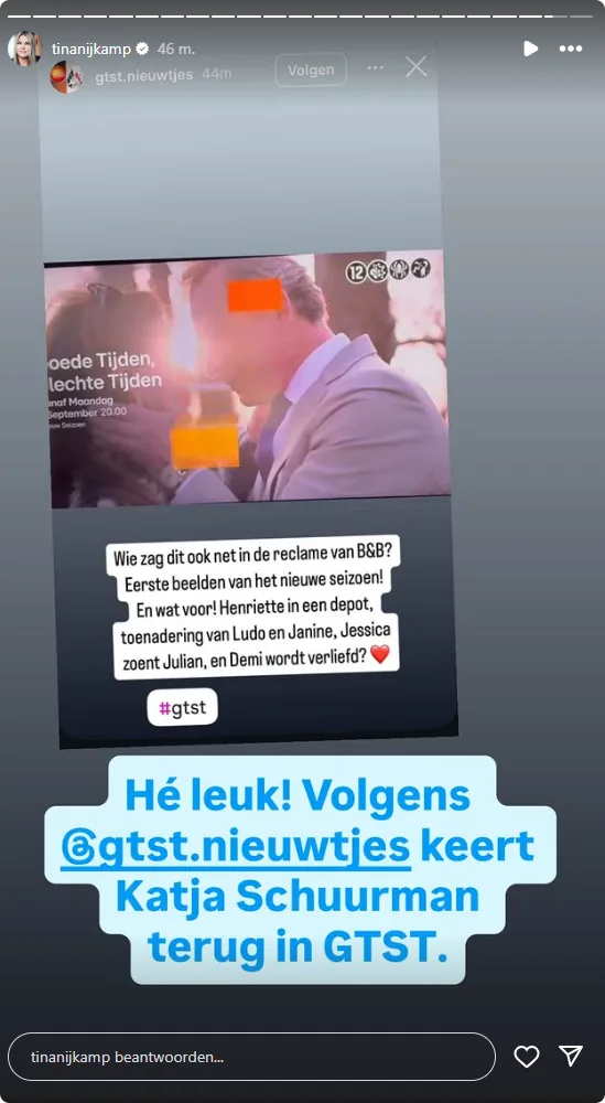 GTST.nieuwtjes op Instagram meldt dat je in de reclame van B&B Vol Liefde de eerste beelden van het nieuwe GTST-seizoen zag. In deze beelden zie je hoe Jessica zoent met Julian! Dus Katja lijkt toch echt terug te keren in de soap. Inmiddels is haar terugkeer ook bevestigd.