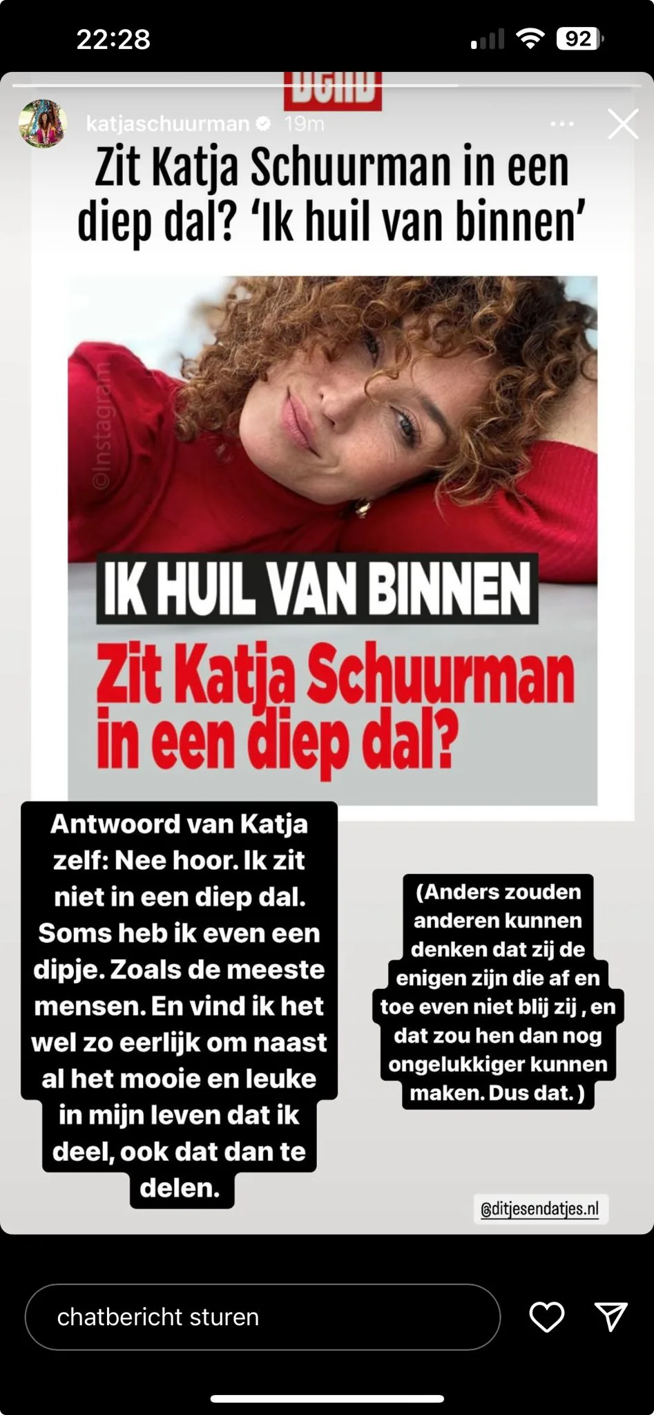 Maar is dit echt het geval? Op Instagram reageert Katja met een screenshot van het artikel: "Nee hoor. Ik zit niet in een diep dal. Soms heb ik even een dipje. Zoals de meeste mensen. En ik vind het wel zo eerlijk om naast al het mooie en leuke in mijn leven dat ik deel, ook dat te delen."
