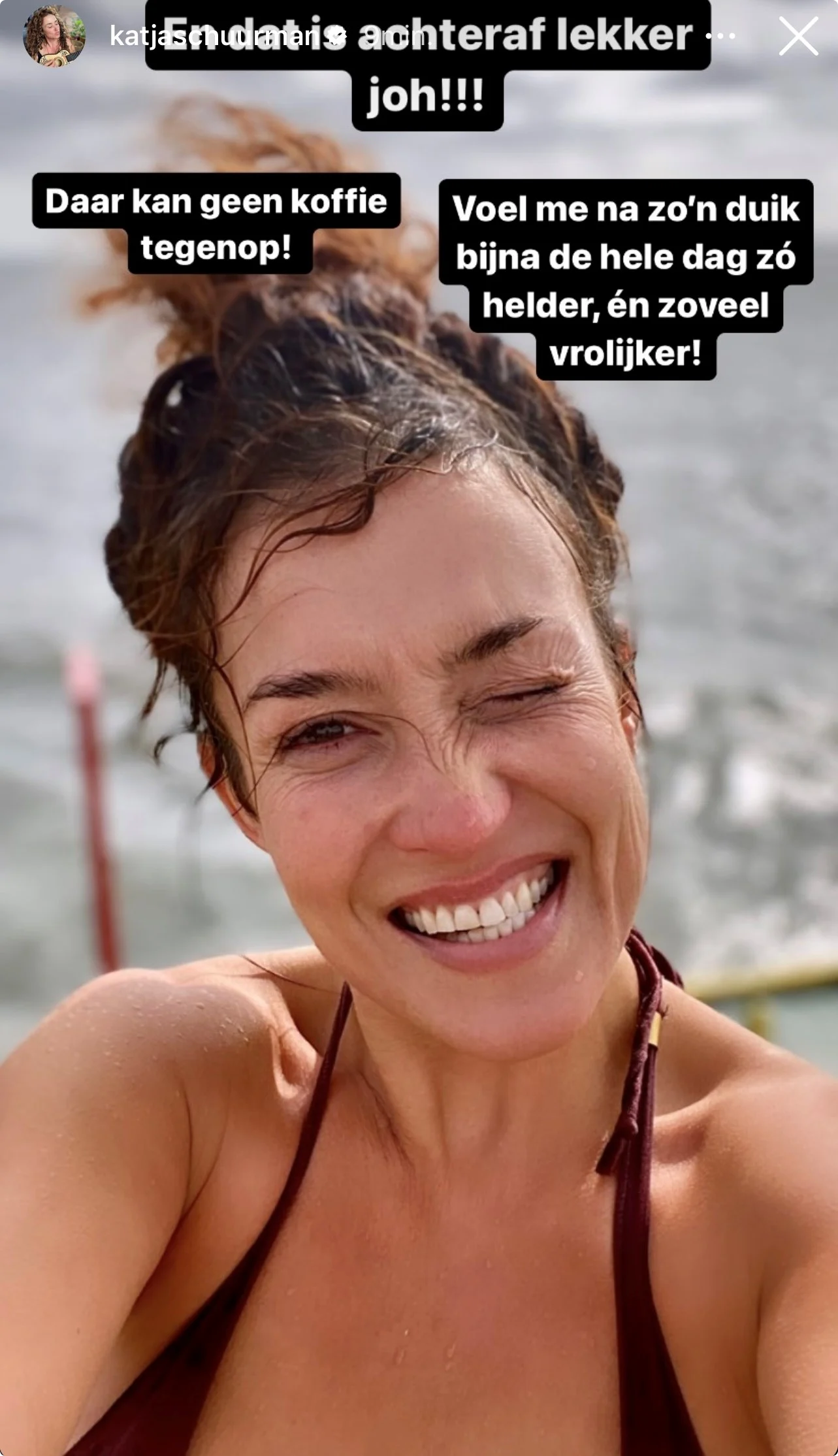 "Nieuwe ontdekking voor mij: elke dag een duik in het inmiddels best koude water. Wat een positieve boost voor mijn lijf, mijn brein en mijn gemoed is dat zeg!" zo schrijft Katja op Instagram. "Paar stevige ademhalingsoefeningen daarna en ik begin mijn dag met een 10-0 voorsprong. Als je geen water om in te zwemmen in de buurt heb, probeer dan toch maar wel eens die koude douche waar je misschien al een poos weerstand bij voelt. Het brengt je écht wat!"