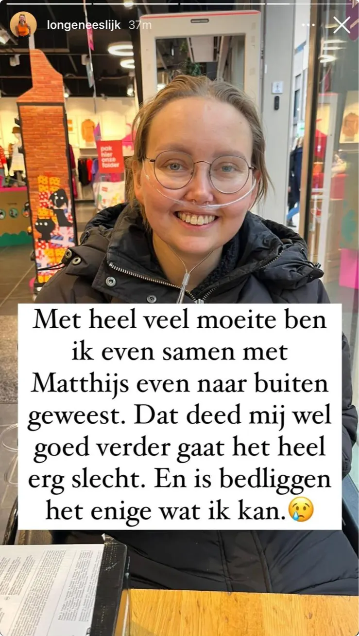 Eva heeft namelijk weer even de deur uit kunnen gaan, een grote stap die haar zichtbaar goed deed. Op Instagram plaatst ze een foto van zichzelf in de HEMA en schrijft: “Met heel veel moeite ben ik even samen met Matthijs naar buiten geweest.” Ze voegt eraan toe: “Dat deed mij wel heel goed. Verder gaat het heel erg slecht en is in bed liggen het enige wat ik kan..."