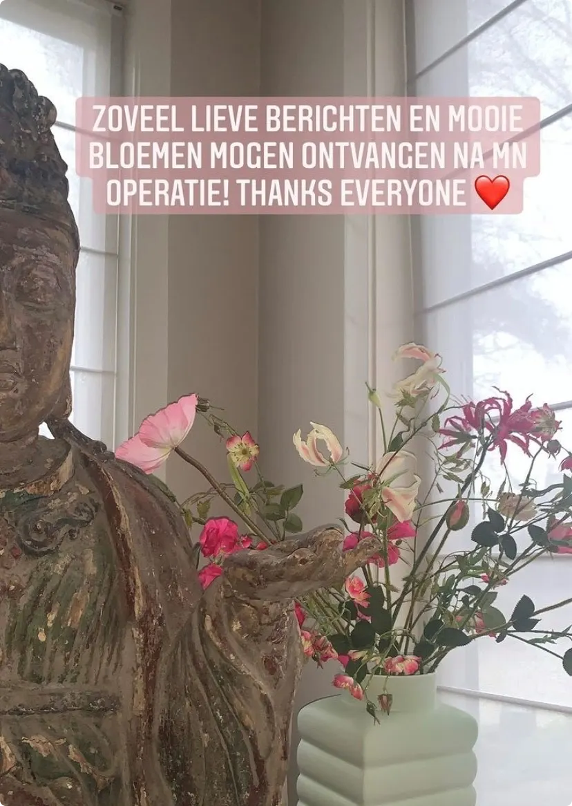 "Zoveel lieve berichten en mooie bloemen mogen ontvangen na mn operatie", schrijft ze bij een foto op haar Story. Verder bedankt ze iedereen nog, inclusief hartje.