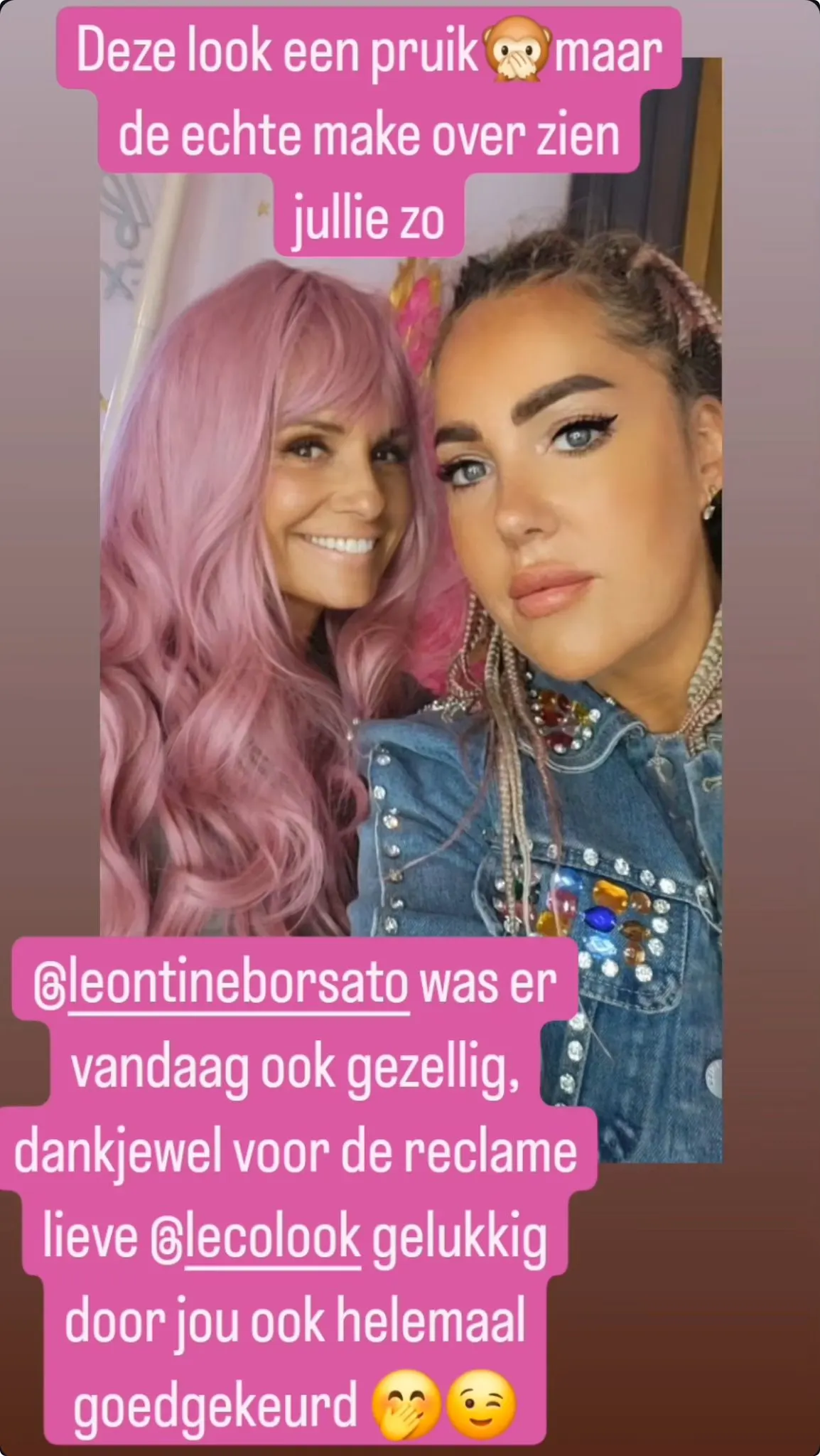 Leontine is langs geweest bij de extension artist Bianca Vink. De twee plaatsen samen een selfie waar Leontine een roze coupe heeft. "Deze look is een pruik, de echte make-over zien jullie zo", schrijft Bianca bij de selfie. Tekst gaat verder onder de Instagram Story.