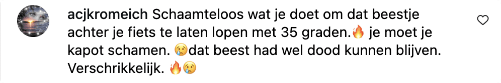 Zo reageert een volger: ''Vraag heb je dit vandaag gefilmd??? Zo ja dan moet je jezelf schamen dat je het hondje achter je aan laat rennen met 35+ graden. Ik vind je een leuk mens maar dit kan echt niet al is het maar voor 20 meter.''