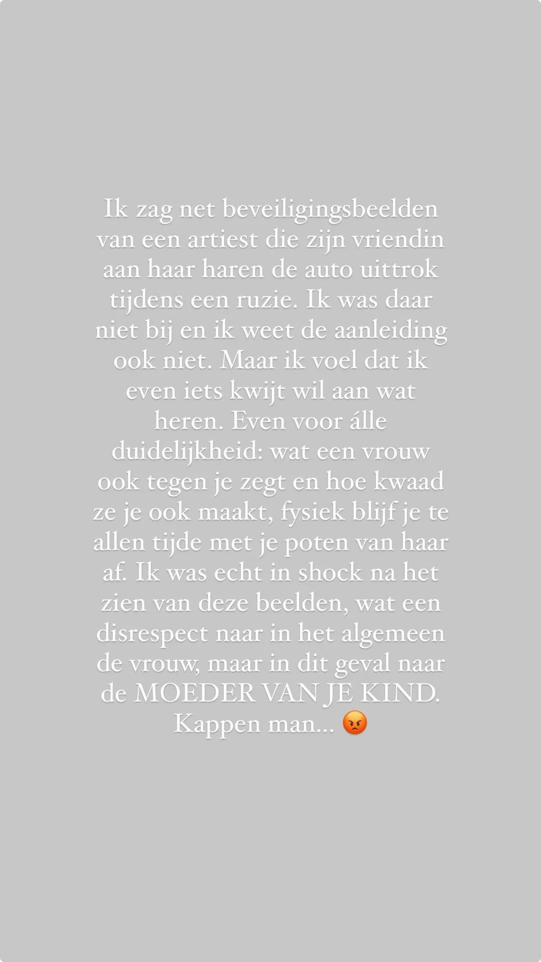 Even voor álle duidelijkheid: wat een vrouw ook tegen je zegt, en hoe kwaad ze je ook maakt, fysiek blijf je ten allen tijde met je poten van haar af. Ik was echt in shock na het zien van deze beelden, wat een disrespect naar in het algemeen de vrouw, maar in dit geval naar de moeder van je kind. Kappen man..."