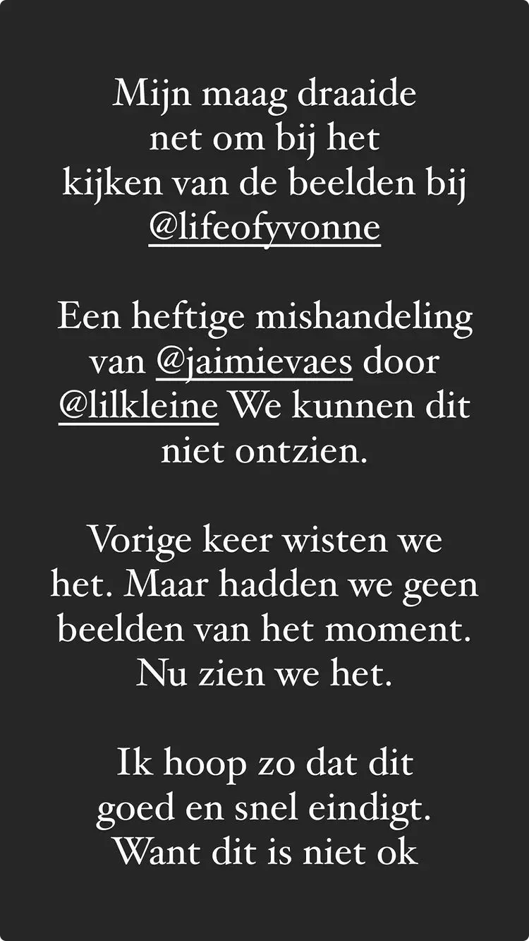 Ook Miljuschka reageerde op haar Instagram Stories. "Mijn maag draaide net om bij het kijken van de beelden bij LifeOfYvonne. Een heftige mishandeling van Jaimie Vaes door Lil' Kleine. We kunnen dit niet ontzien. Vorige keer wisten we het. Maar hadden we geen beelden van het moment. Nu zien we het. Ik hoop zo dat dit goed en snel eindigt. Want dit is niet ok."