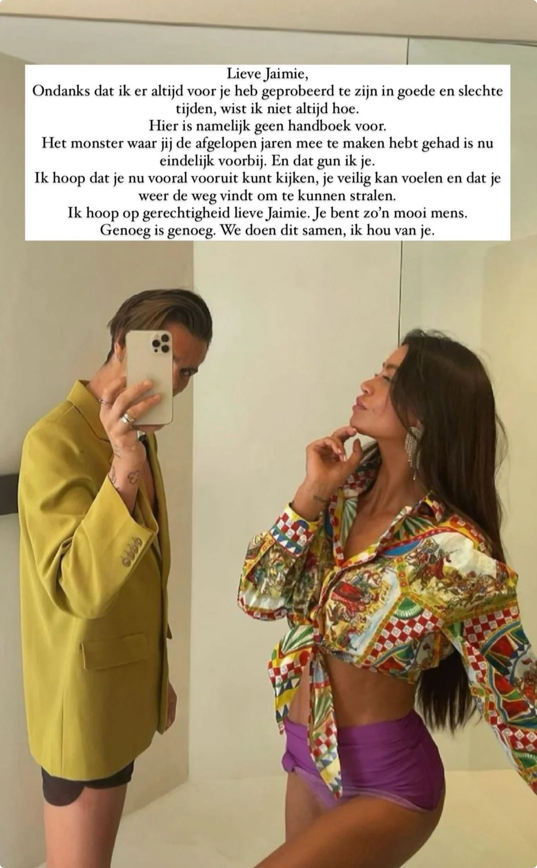 Zo schrijft hij: "Lieve Jaimie. Ondanks dat ik er altijd voor je heb geprobeerd te zijn in goed en slechte tijden, wist ik niet altijd hoe. Hier is namelijk geen handboek voor. Het monster waar jij de afgelopen jaren mee te maken hebt gehad is nu eindelijk voorbij. En dat gun ik je. Ik hoop dat je nu vooral vooruit kunt kijken, je veilig kan voelen en dat je weer de weg vindt om te kunnen stralen. Ik hoop op gerechtigheid lieve Jaimie. Je bent zo'n mooi mens. Genoeg is genoeg. We doen dit samen, ik hou van je."