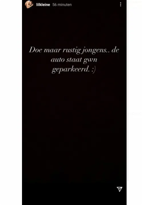 Volgens Lil' Kleine is dit echter niet waar. Nadat hij blijkbaar ongeruste reacties heeft ontvangen, schrijft hij: "Doe maar rustig, jongens... De auto staat gewoon geparkeerd."