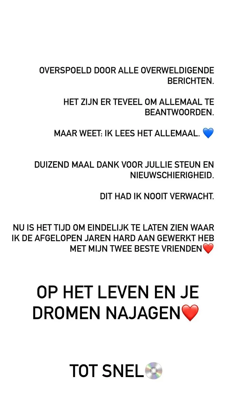 "Nu is het tijd om eindelijk te laten zien waar ik de afgelopen jaren hard aan gewerkt heb met mijn twee beste vrienden. Op het leven en je dromen najagen", sluit de 23-jarige af.