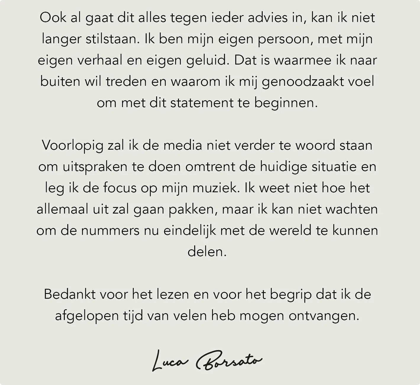 Volgens Luca gaat die beslissing tegen het advies in dat hij heeft gekregen, maar hij wil niet langer stilstaan. "Ik ben mijn eigen persoon, met mijn eigen verhaal en eigen geluid. Dat is waarmee ik naar buiten wil treden en waarom ik mij genoodzaakt voel om met dit statement te beginnen."