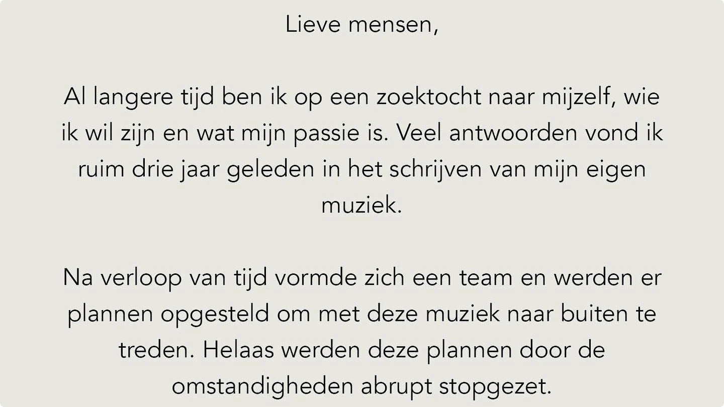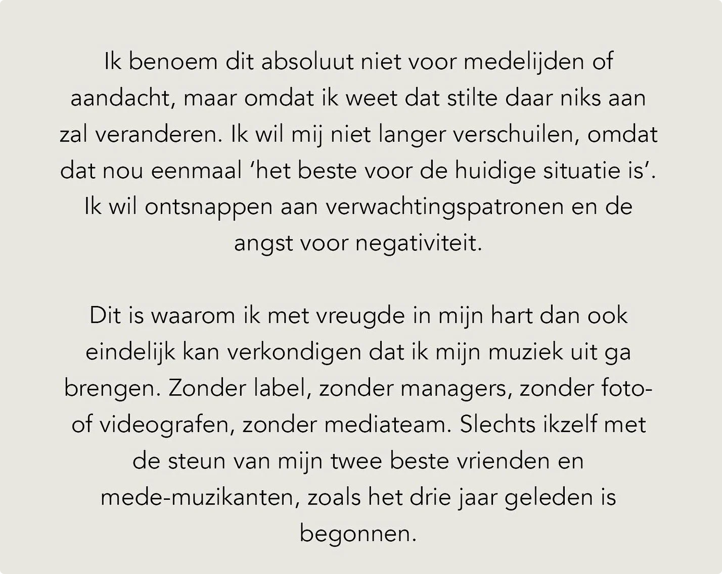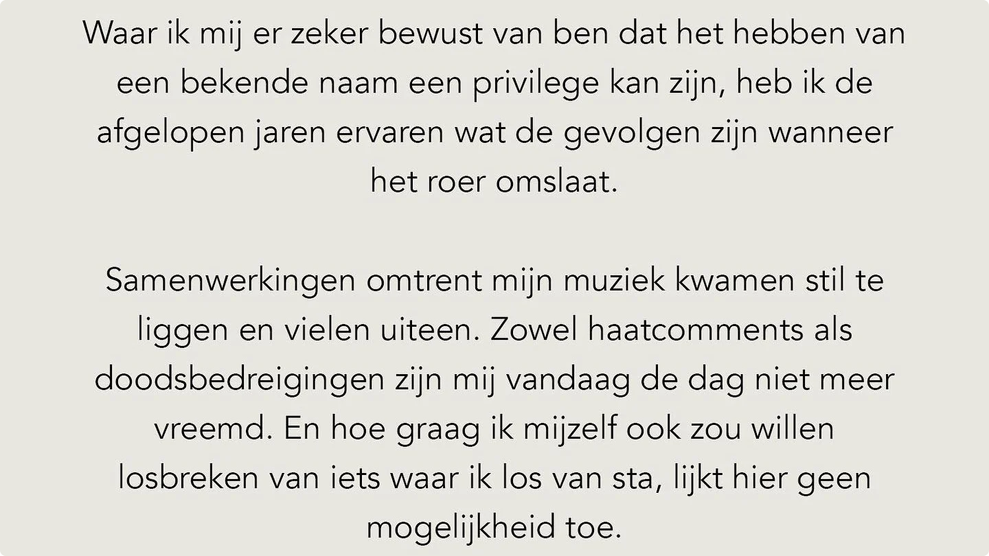"Zowel haatcomments als doodsbedreigingen zijn mij vandaag de dag niet meer vreemd. En hoe graag ik mijzelf ook zou willen losbreken van iets waar ik los van sta, lijkt hier geen mogelijkheid toe." De zanger schrijft het bericht niet om "medelijden of aandacht", maar wil zich "niet langer verschuilen". Om die reden heeft hij besloten zijn muziek zelf uit te gaan brengen. "Zonder label, zonder managers, zonder foto- of videografen, zonder mediateam."