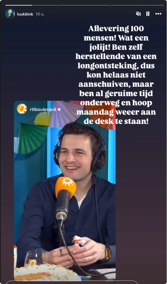 De presentator, die eind vorige maand nog terugblikte op het omstreden fragment van RTL Boulevard met Rob Goossens dat werd verwijderd (zie video), is geveld door een longontsteking. Daarom is hij al bijna een week niet te zien in het entertainmentprogramma. Gelukkig is hij wel aan de beterende hand, zo vertelt hij. Alleen kon hij hierdoor niet aanschuiven bij opnames van de honderdste aflevering van podcast van het programma. Luuk hoopt maandag weer achter de desk te staan.