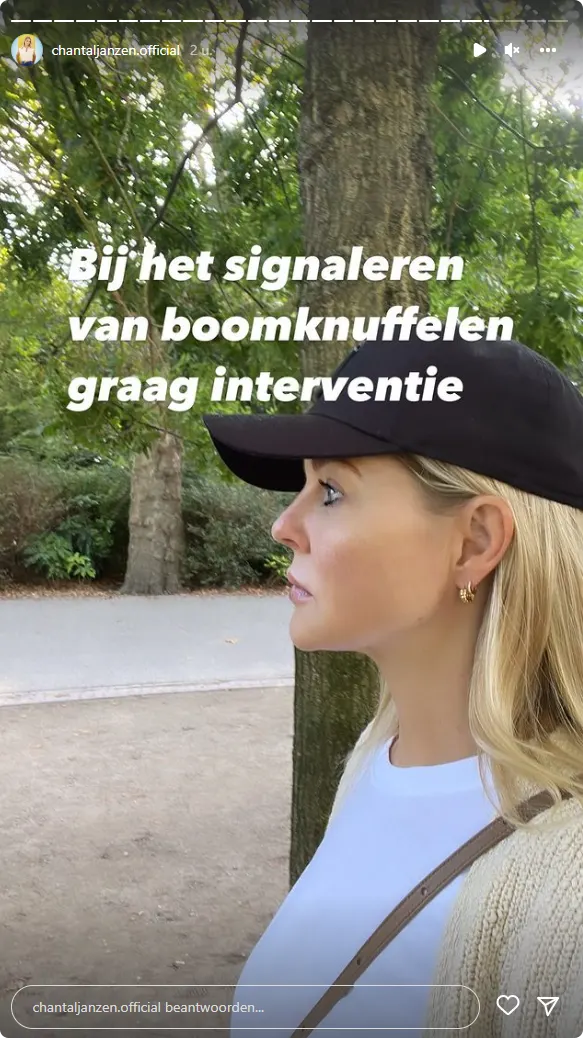 Nadat haar Stories volledig volstaan met natuurfoto's plaatst ze na een tijdje: "Bij het signaleren van boomknuffelen graag interventie bellen". Het lijkt erop dat de blondine verwijst naar het nieuwe ritueel van Dave. Zie onderstaande foto's.