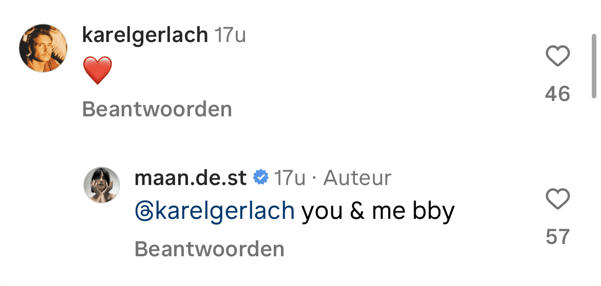 Karel reageert met een hartje onder de post. Hier reageert Maan weer op met: "Jij en ik, baby." Hiermee lijken ze dus te ontkennen dat ze uit elkaar zijn, nadat er verschillende geruchten over rondgingen.