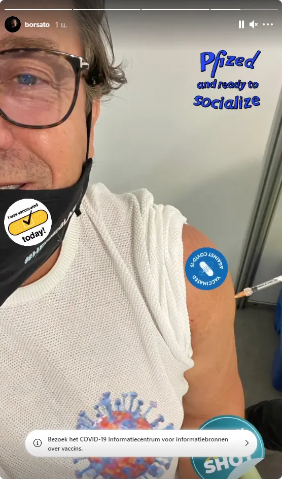 Op zijn Instagram Stories deelt hij een foto van de priklocatie. "Pfized en klaar om te socializen", valt erbij te lezen. "Ik ben vandaag gevaccineerd", staat er ook. Daarnaast maakt hij duidelijk dat het al zijn tweede 'shot' is.