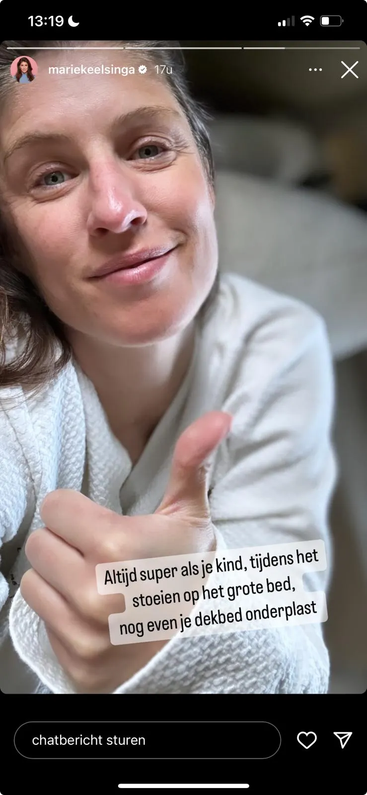 Marieke vertelt hoe ze samen met haar kind aan het stoeien was op het grote bed, toen plotseling bleek dat haar kindje op het dekbed had geplast. Met een vleugje sarcasme reageert de presentatrice op deze onverwachte wending door een foto van zichzelf te delen waarop ze haar duim opsteekt, gevolgd door de caption: "Super".