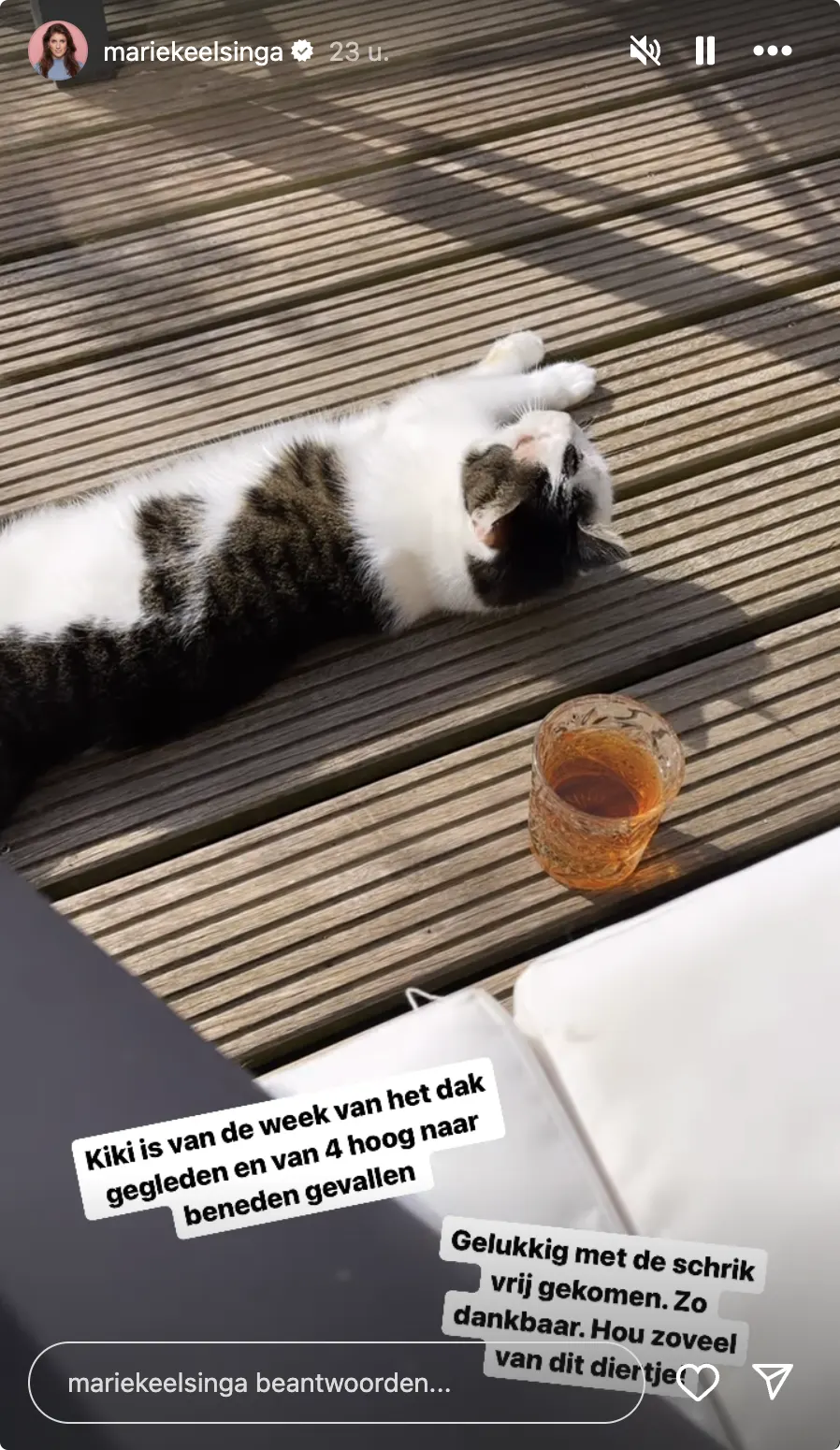 "Elke dag zo blij dat zij leeft", aldus Marieke in haar Instagram Stories terwijl ze Kiki filmt. "Kiek is van de week van vier hoog naar beneden gevallen. Ze gleed uit over de dakgoot en viel hier op de stenen van de onderbuurvrouw."