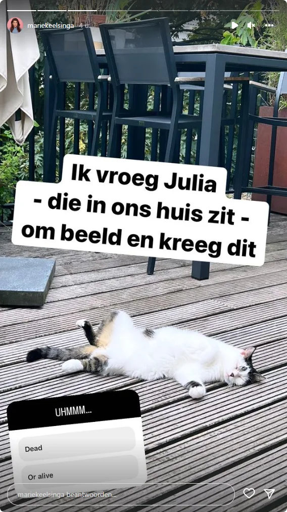 Uit paniek wilde ze weten of haar kat Kiki nog in leven was. "Ik vroeg Julia - die in ons huis zit - om beeld en kreeg dit." Maar of Marieke op deze manier duidelijkheid heeft gekregen...