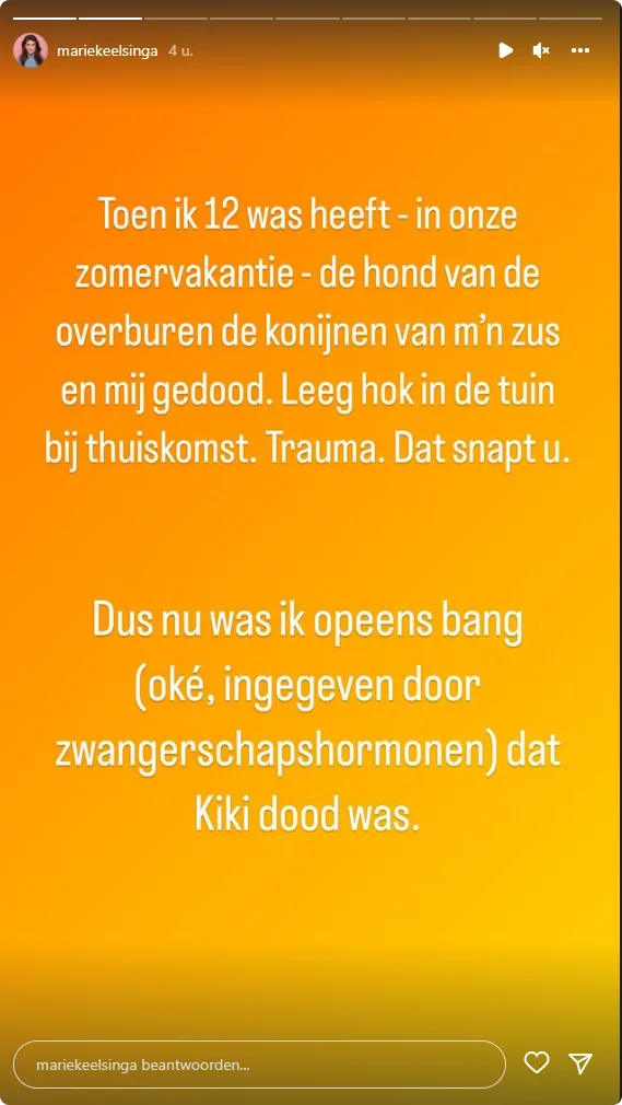 "Toen ik 12 was heeft - in onze zomervakantie - de hond van de overburen de konijnen van m'n zus en mij gedood. Leeg hok in de tuin bij thuiskomt. Trauma. Dat snapt u", schrijft de presentatrice en radio-dj op Instagram.