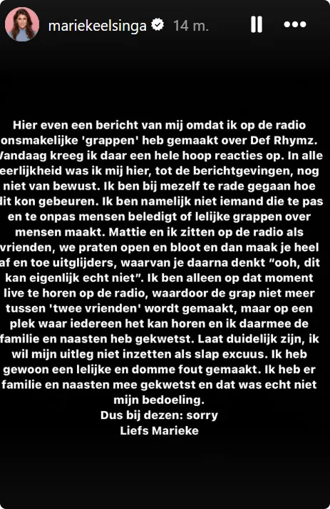 "Hier even een bericht van mij omdat ik op de radio onsmakelijke 'grappen' heb gemaakt over Def Rhymz", begint ze haar verhaal op Instagram Stories. "Ik ben bij mezelf te rade gegaan hoe dit kon gebeuren. Ik ben namelijk niet iemand die te pas en te onpas mensen beledigt of lelijke grappen over mensen maakt. Mattie en ik zitten op de radio als vrienden, we praten open en bloot en dan maak je heel af en toe uitglijders, waarvan je daarna denkt: 'Oh, dit kan eigenlijk echt niet'". Marieke schrijft dat ze haar uitleg niet in wil zetten als 'slap' excuus. "Ik heb gewoon een lelijke en domme fout gemaakt." Ze zegt sorry en vertelt dat het niet haar bedoeling was familie en naasten te kwetsen.