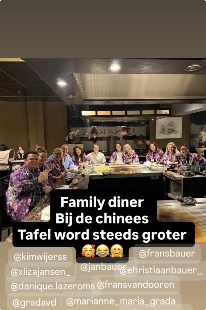 Mariska taggt de dame in kwestie ook al: het gaat om Liza. Er wordt gedineerd in, uiteraard, een Chinees restaurant en het ziet er super gezellig uit. "Family diner bij de Chinees. De tafel wordt steeds groter." Later op de avond trokken alle aanwezigen ook nog eens een kimono aan om helemaal in de Aziatische sferen te komen langs de bakplaat. Beelden daarvan zie je in de video bovenaan.
