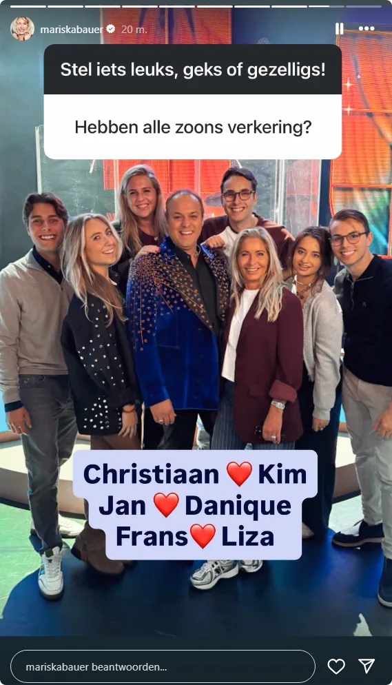 Later bevestigt Mariska in haar Instagram Story nogmaals dat alle telgen nu van de markt zijn. Christiaan is hotel de botel op zijn Kim, Jan is verliefd op Danique en Frans Junior heeft dus een relatie met Liza. One happy family! Frans Junior was sinds mei vorig kalenderjaar weer single nadat de relatie met zijn ex, die wel nog in de tv-serie De Bauers te zien is geweest, spaak liep.