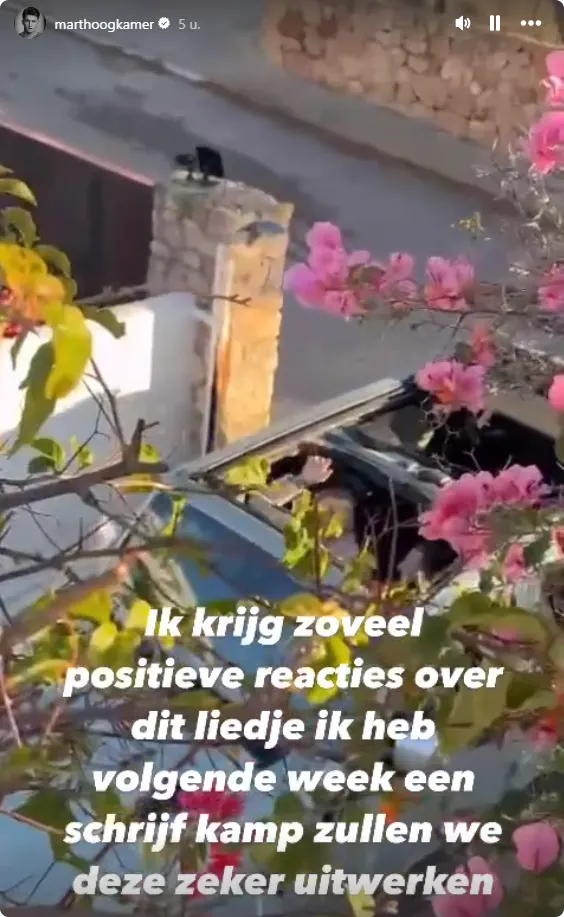 Mart is namelijk bezig met nieuwe muziek. De zanger schrijft bij een snippet van een nieuw nummer dat hij volgende week een schrijfkamp heeft. "Niet alleen dit liedje natuurlijk. Ik ben zo stil geweest met muziek dat we ook zeker het album uitwerken", schrijft Mart op Instagram.
