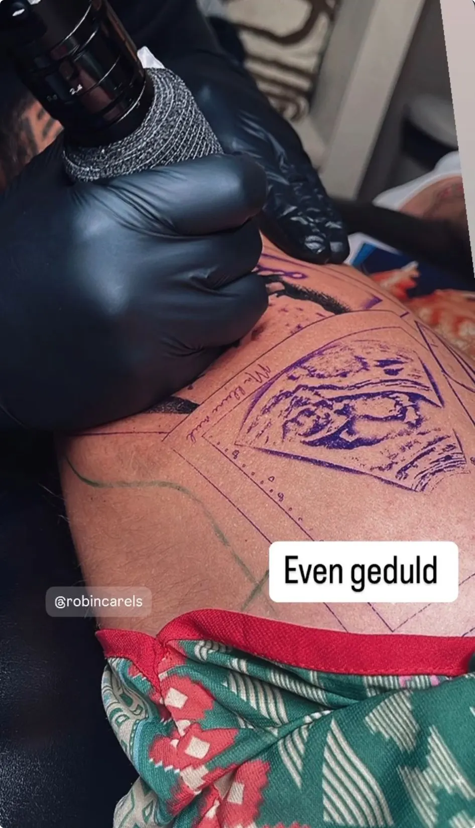 De zanger is de tatoeëerstoel ingedoken voor een bijzonder project. Hij is namelijk bezig om de echo van zijn dochter op zijn been te laten zetten. Op het moment dat de foto is genomen, zit een groot gedeelte er al op. Toch moet hij nog heel even wachten tot het eindresultaat. "Even geduld", schrijft hij erbij. Zie de foto hieronder, gevolgd door een video met de eerste beelden van de baby.