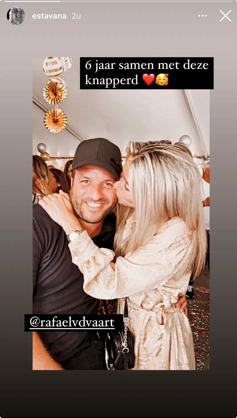 ''6 jaar samen met deze knapperd'', aldus Estavana op Instagram. Rafael deelt een lief bericht en schrijft daaronder: ''6 years and counting. Happy me & you day.'' De twee kunnen op veel leuke reacties rekenen. Zo schrijft iemand: ''Heerlijk stel. Lekker met beide benen op de grond.'' Een ander feliciteert Estavana en Rafael met: ''Van harte gefeliciteerd samen!''