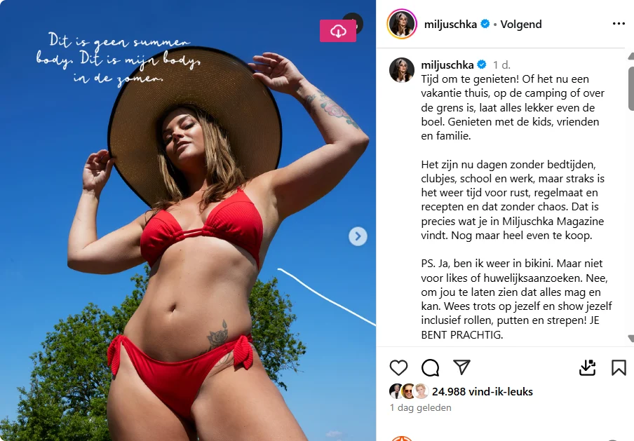 Zo schrijft ze onder meer bij de zomerkiekjes: "Ja, ben ik weer in bikini. Maar niet voor likes of huwelijksaanzoeken. Nee, om jou te laten zien dat alles mag en kan. Wees trots op jezelf en show jezelf inclusief rollen, putten en strepen! JE BENT PRACHTIG." Haar volgers reageren massaal. "Alleen maar liefde!", aldus iemand. En een ander: "Mooie foto's." En Chantal Janzen reageert: "Ik stuur jou volgende week ook een bikinipic."