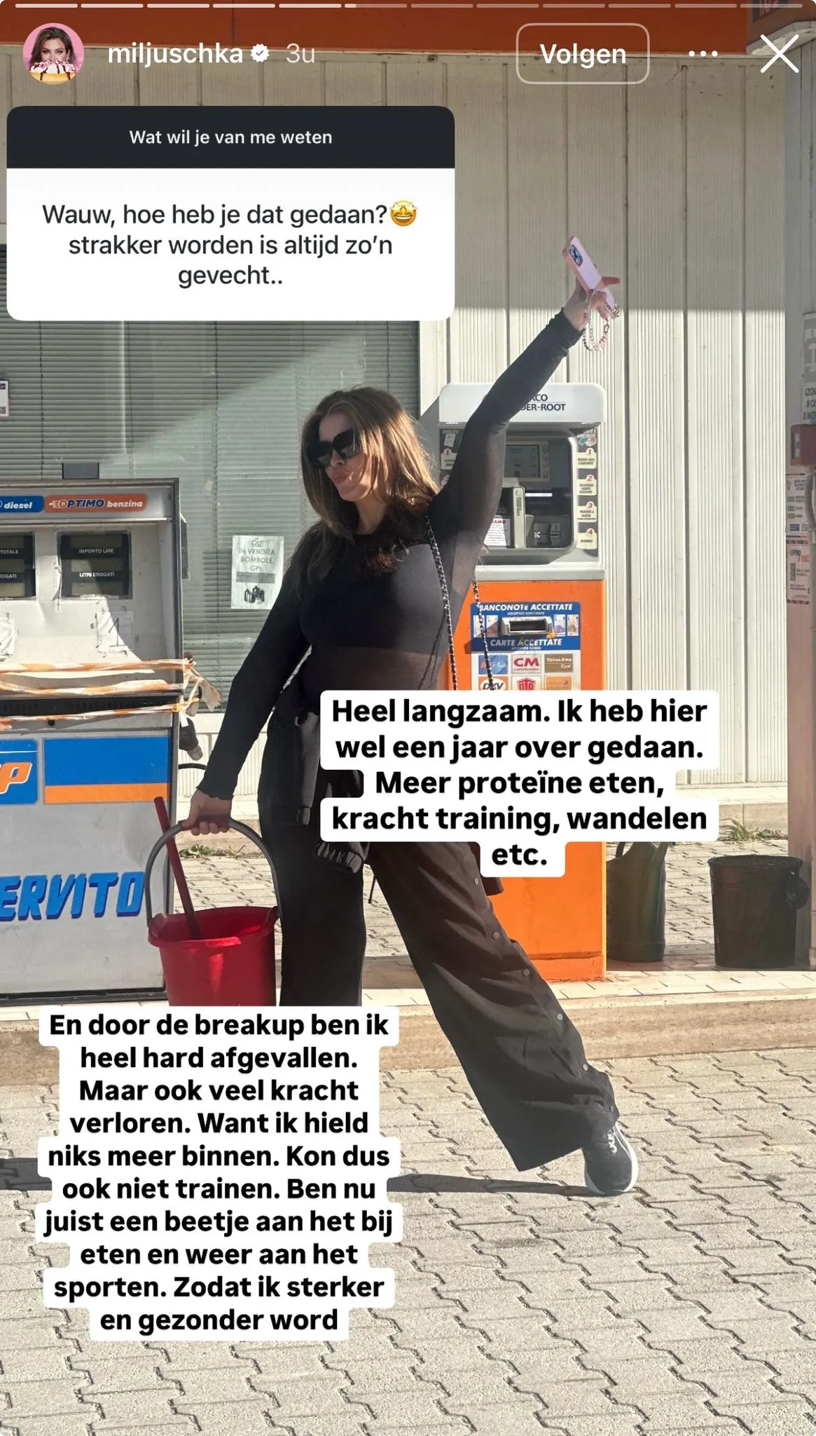 Daarna schrijft ze dat het tijdens de periode na haar breuk sneller ging. "Door de break-up ben ik heel veel afgevallen, maar ook veel kracht verloren." Miljuschka schrijft dat ze niets meer binnenhield en dus niet kon trainen. Ze is nu weer een beetje aan het bijeten en weer begonnen met sporten, zodat ze sterker en gezonder wordt.