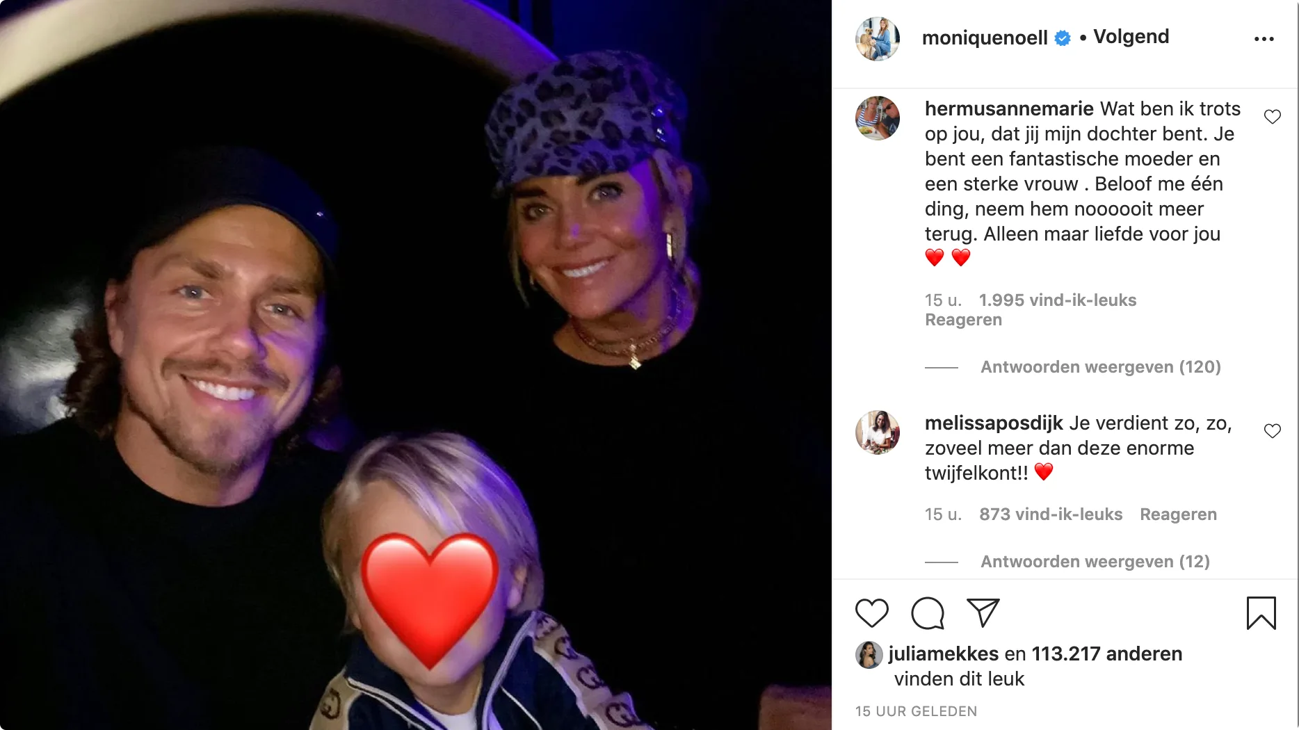 Monique heeft woensdag uitgebreid gereageerd op de breuk in een emotionele post op Instagram en haar moeder schrijft in een reactie onder haar bericht: "Wat ben ik trots op jou, dat jij mijn dochter bent. Je bent een fantastische moeder en een sterke vrouw. Beloof me één ding, neem hem noooooit meer terug. Alleen maar liefde voor jou."
